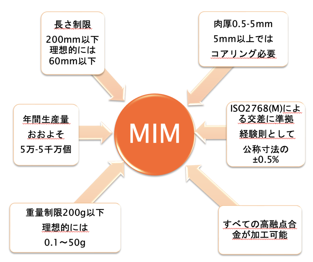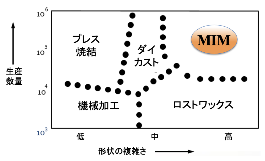 MIM(金属粉末射出成形)金属粉末を原料とした部品製造法の一種で、金属粉末冶金法とプラスチック射出成型法を組み合わせたもの。